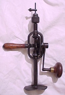 Somehow, this little breast drill ended up with a permanently mounted, patented Jacobs chuck. The key is a modern one, which fits nevertheless. Talk about getting it right the first time. Another Sanford Moss find. Return to Main Drills Page