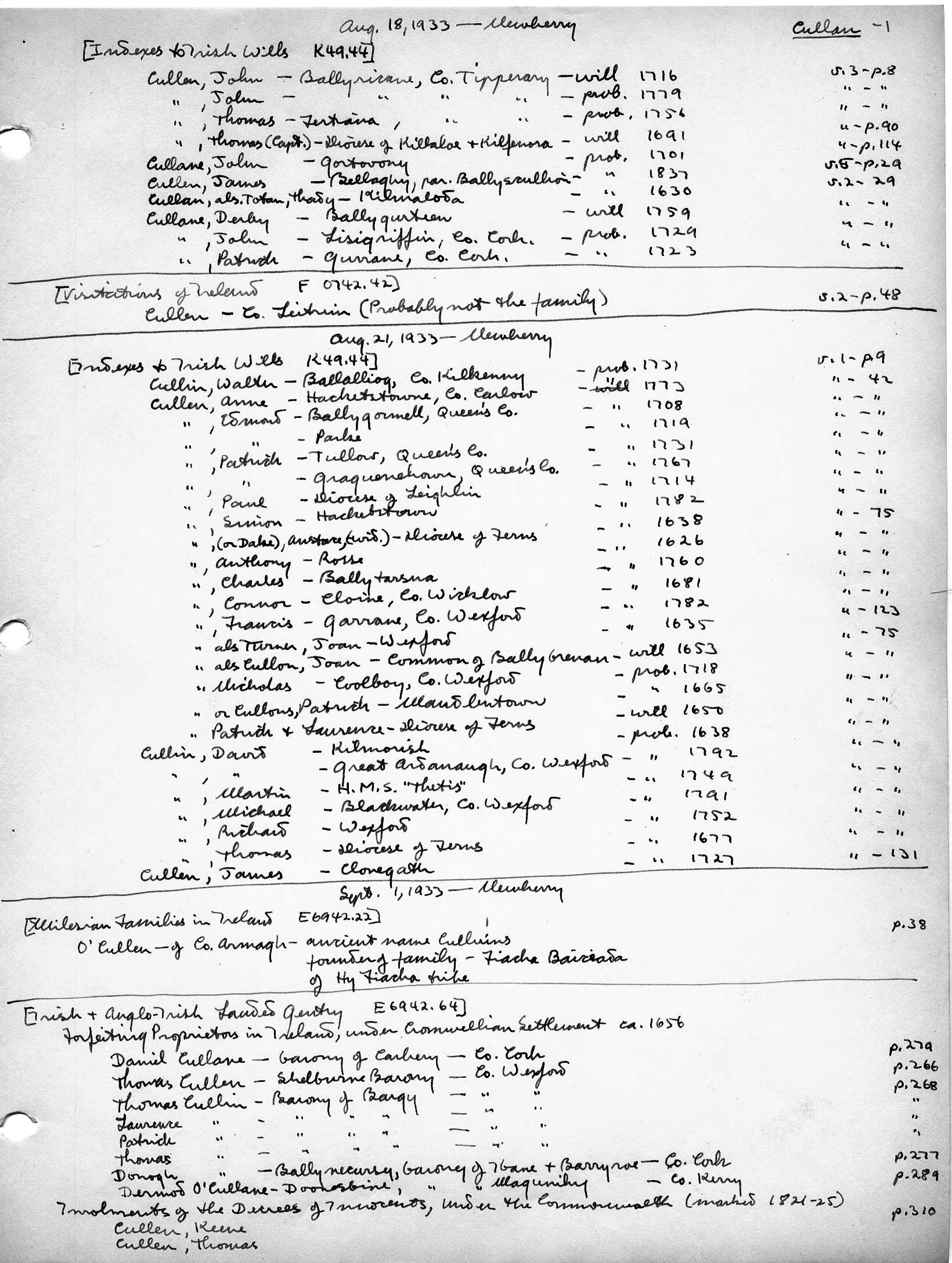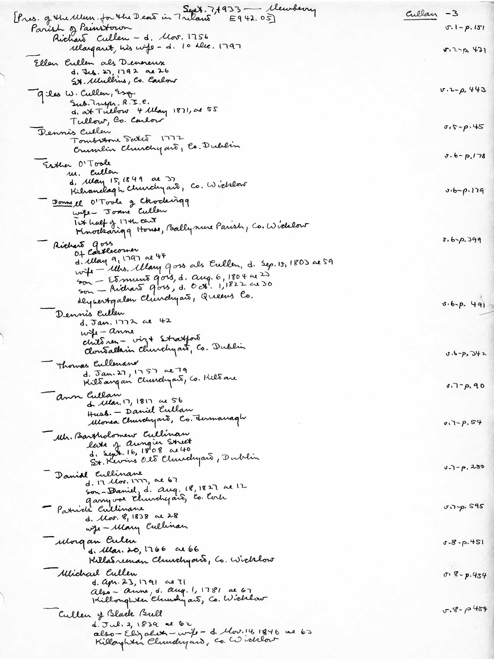 7 Sep.1933: Newberry: Preservation of the Memorials of the Dead in Ireland E942.05: (many Cullen references.) |