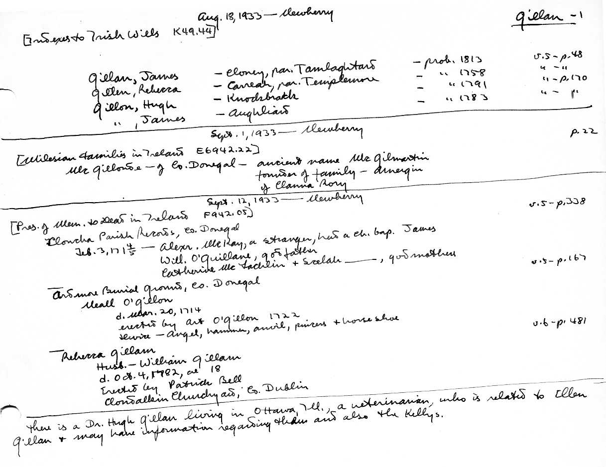 Gillan-001.jpg | 18 Aug., 1 & 12 Sep.1933: Newberry: Indexes to Irish Wills K49.44; Milesian Families in Ireland E6942.22; Preservation of Memorials to the Dead in Ireland F942.05; and Ref. to Dr. Hugh Gillan, living in Ottawa, Ill.: many Gillan references. |