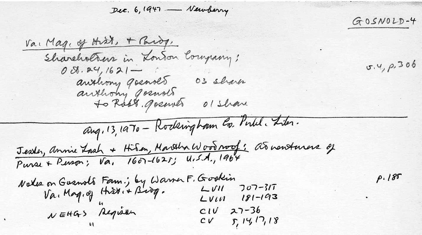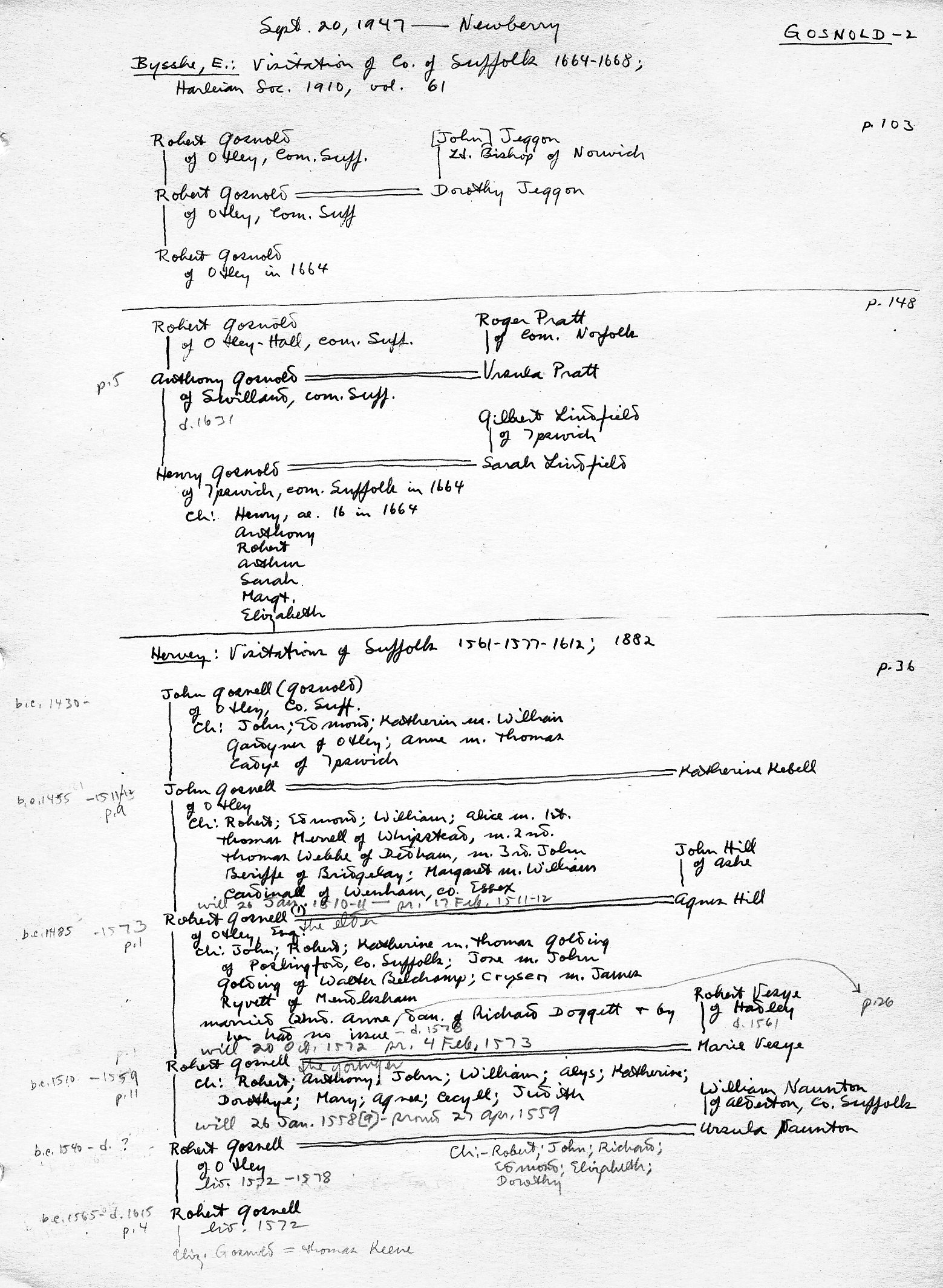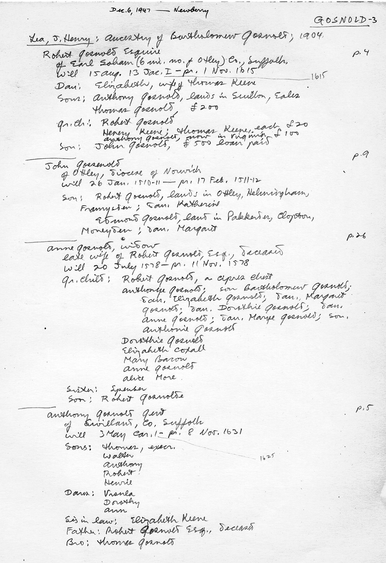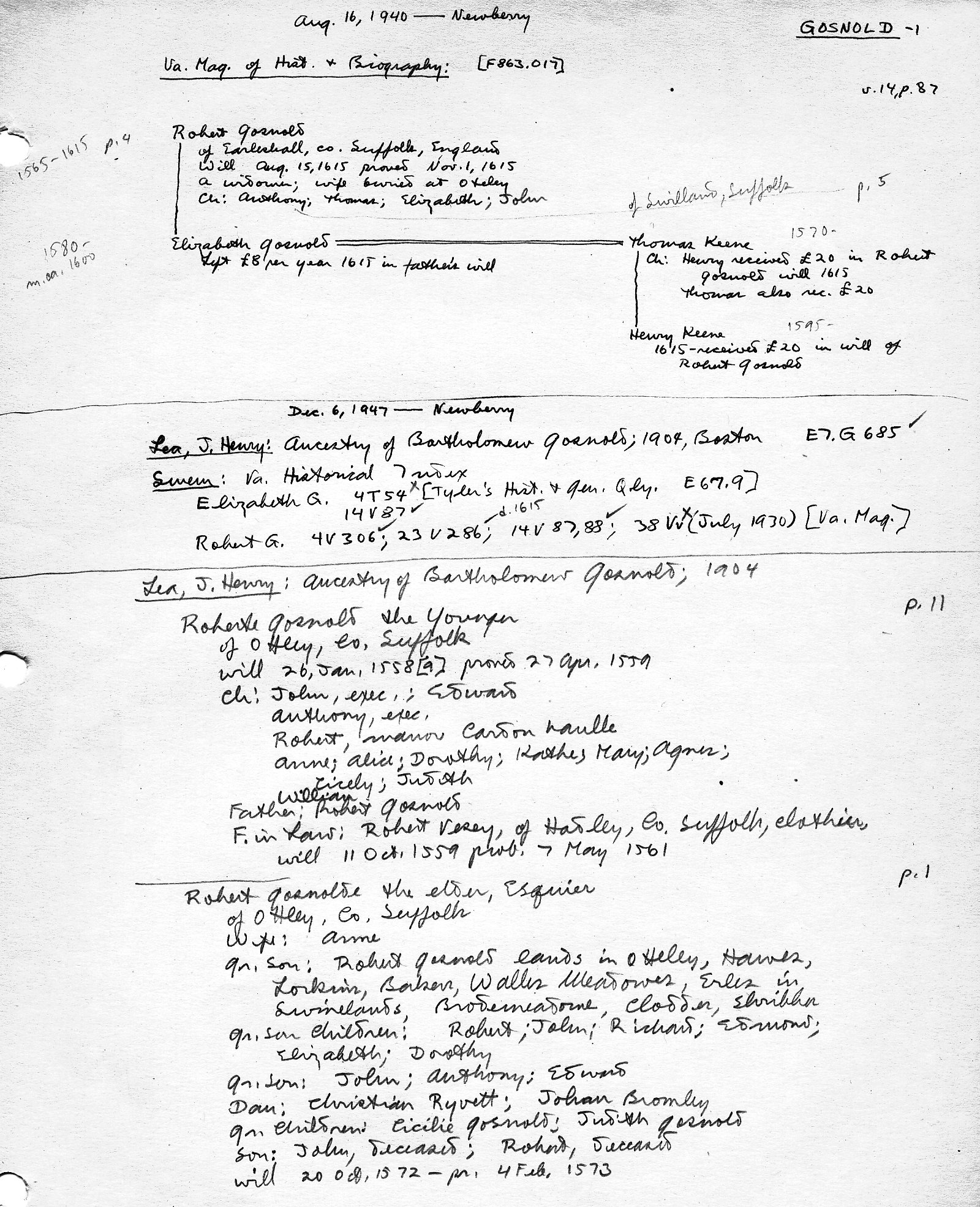 Aug.1940 & 6 Dec.1947: Newberry Library; Lea, J. Henry: Ancestry of Bartholemew Gosnold;