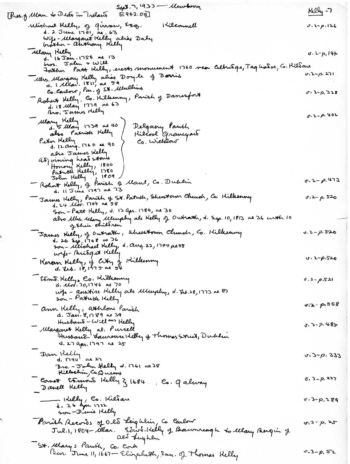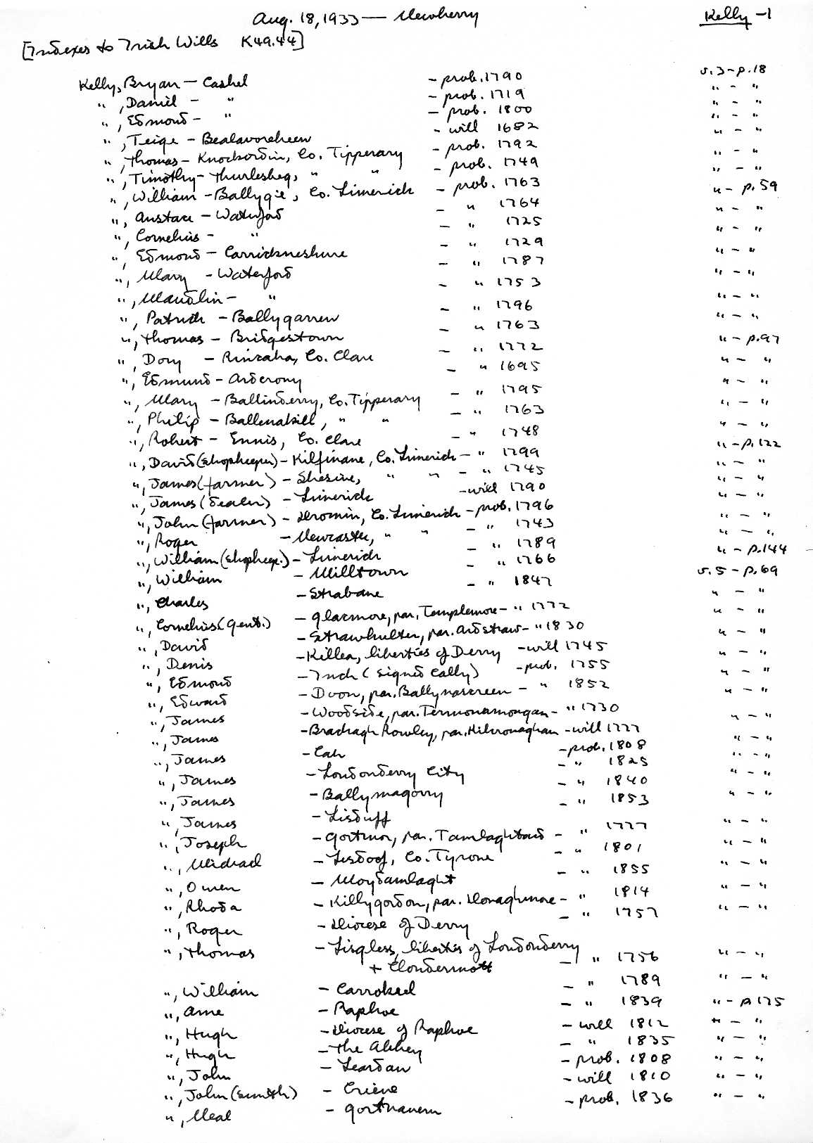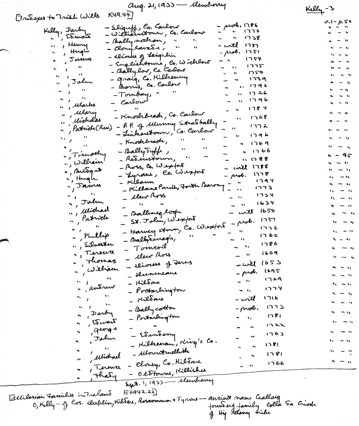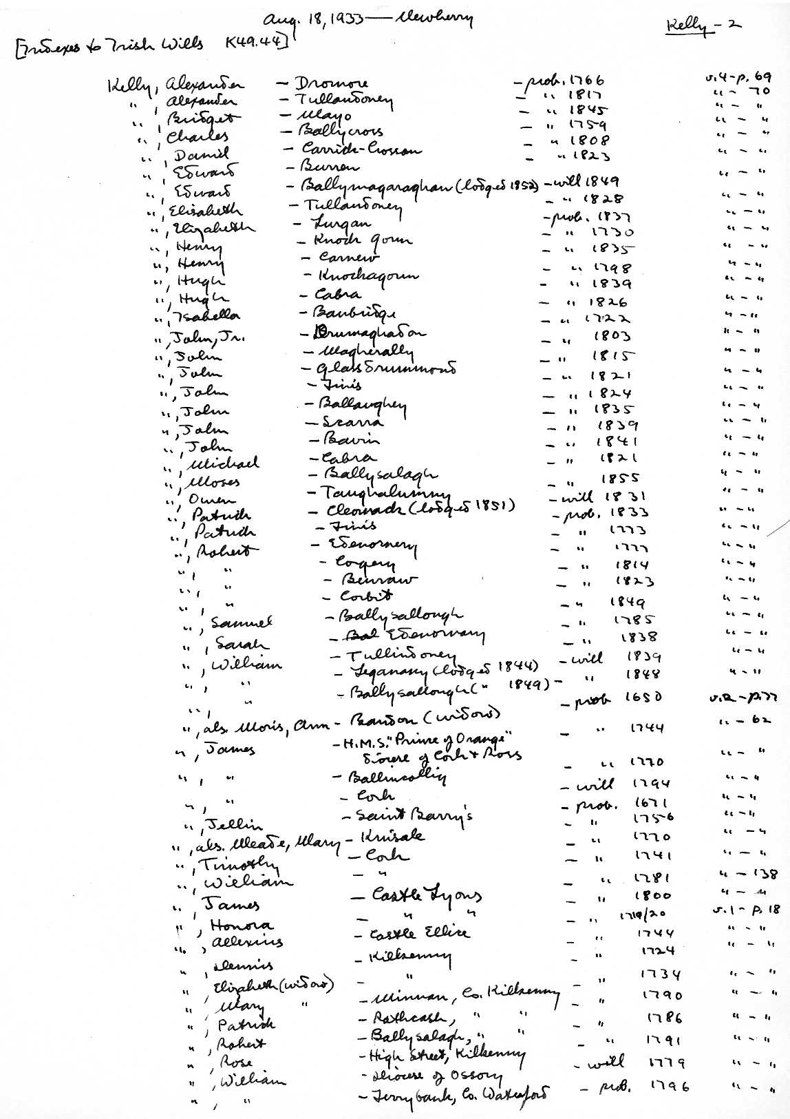 18 Aug.1933: Newberry: Indexes to Irish Wills K49.44: many Kelly references.