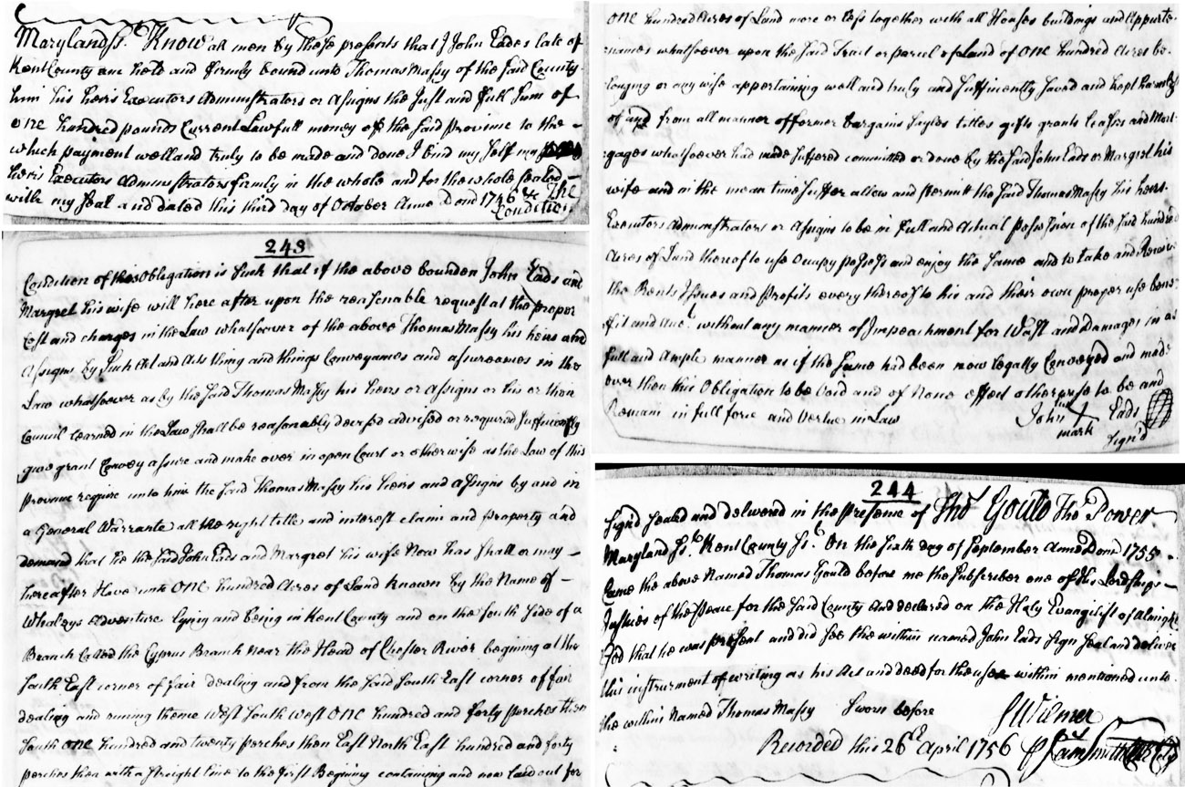 | April 26, 1756: Thomas Massey sells for a legally enforceable bond of £100 the 100 acre tract known as Whaleys Adventure, lying in Kent County on the South side of the Cypress Branch near the head of Chester River, to John Cades and wife Margaret of Kent County. Thomas Massey can stay in full possession and occupy the land and may keep it if the bond is not discharged. Courses: Beginning at the South East corner of Fair Dealing, and running thence West South West one hundred and forty perches, then South one hundred and twenty perches, then East North East [one] hundred and forty perches, then with a straight line to the beginning. Thomas Gould attested to the validity of John Cades' signature. Acting for the Crown: Justice of the Peace S[imon] Wilmer; James Smith is Kent County clerk. |