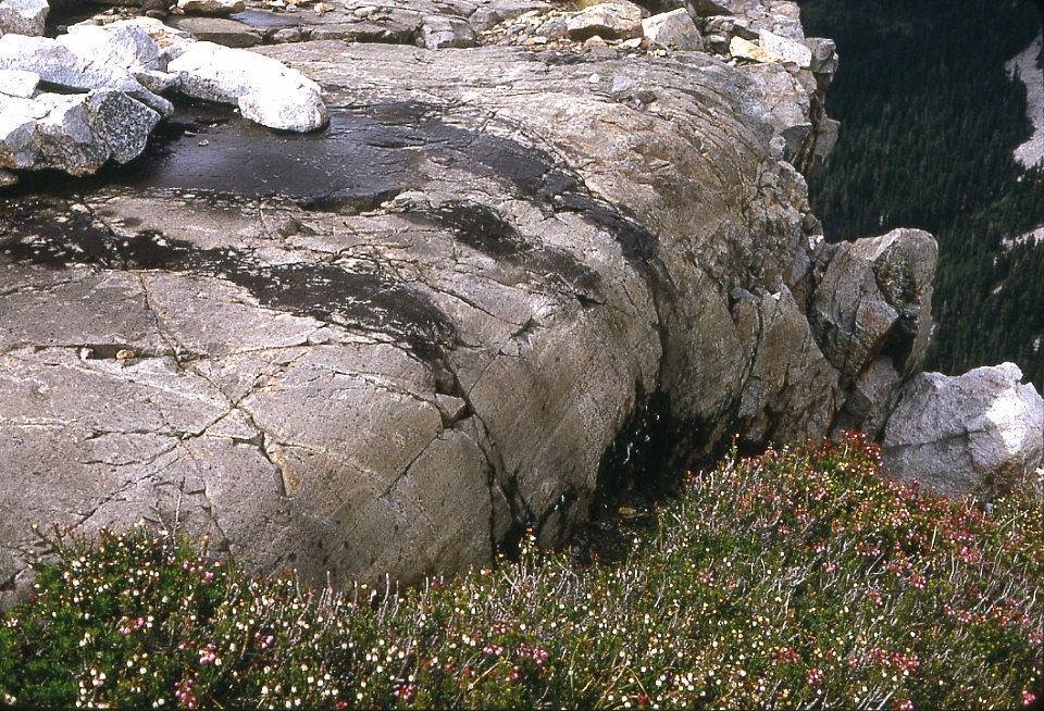 The scene at left is what came into view upon reaching Whatcom Pass. It looks very much like the view of Crawford Notch from Mt. Willard in New Hampshire. The glacier that formed Crawford Notch overrode Mt. Willard, plucking rock from its face so as to form a cliff with one of the most impressive views in the eastern US. Much the same seems to have happened here at Whatcom Pass. |
